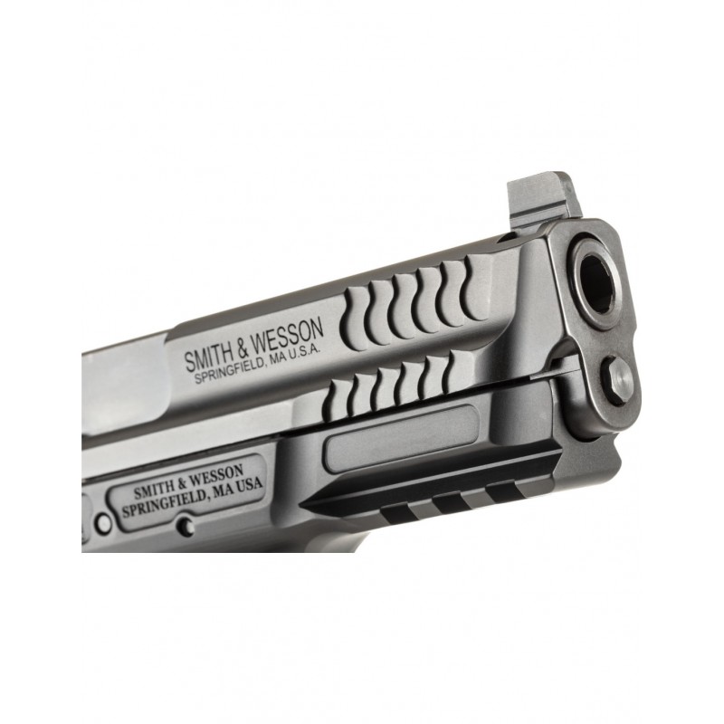 La pistola M&P M2.0 da un a paso adelante y ahora viene con armazón metálico, que proporciona una base extraordinaria para un mayor rendimiento. Diseñada para uso personal, deportivo y profesional, la M&P M2.0 ofrece una plataforma completamente nueva, que presenta características innovadoras en casi todos los aspectos de la pistola, incluido el gatillo, la empuñadura, el marco y el acabado. Los aspectos más destacados de la pistola M&P M2.0 incluyen un chasis de acero inoxidable extendido y una alta relación entre el agarre y el eje del orificio del cañón para reducir la elevación de la boca y una recuperación más rápida del objetivo. La pistola M&P M2.0 mejora aún más el rendimiento con un gatillo más nítido y afinado, un tirón más ligero y un reinicio táctil y audible. La pistola incluye una empuñadura de textura agresiva y cuatro inserciones palmswell intercambiables para un ajuste óptimo en la mano y alcance del gatillo.